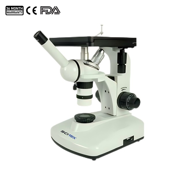 مراقبة عينات كبيرة الحجم: يقع الهدف والعدسة للمجهر الميتالوغرافي المقلوب فوق العينة، مما يسمح له بمراقبة عينات كبيرة الحجم، وهو أمر بالغ الأهمية لأبحاث علوم المواد حيث يمكن أن تكون أحجام العينات كبيرة جدًا في بعض الأحيان.