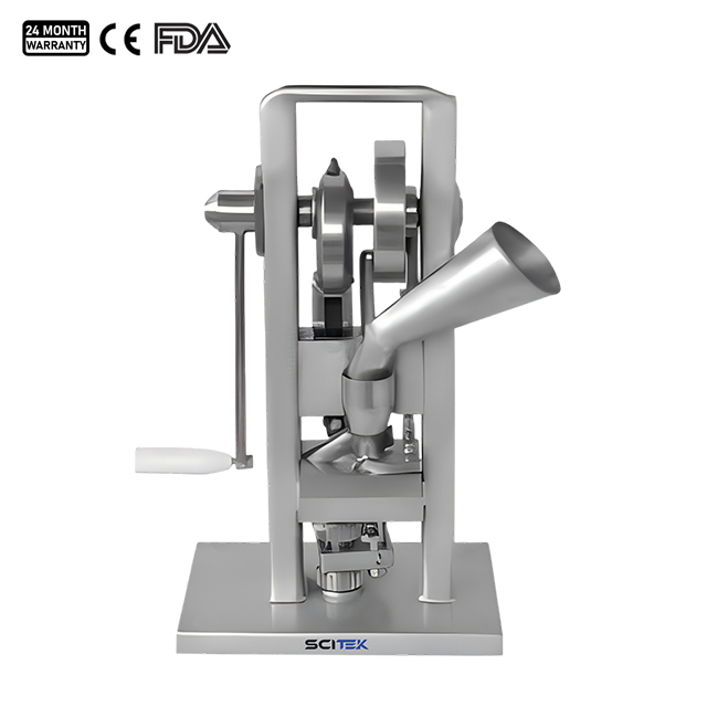 مكبس الأقراص اليدوي ذو التثقيب المفرد عبارة عن مكبس أقراص يدوي صغير الحجم لسطح المكتب، والذي يمكنه تثقيب الأقراص المستديرة في حدود 12 مم، وهو مناسب للمؤسسات الصيدلانية والكيميائية والغذائية والطبية والأقسام الأخرى. تتميز هذه الآلة بمزايا عدم الحاجة للكهرباء وسهولة حملها. يمكن تدويرها يدوياً ويمكن الحصول على الأقراص المطلوبة عن طريق استبدال قوالب ذات مواصفات مختلفة.